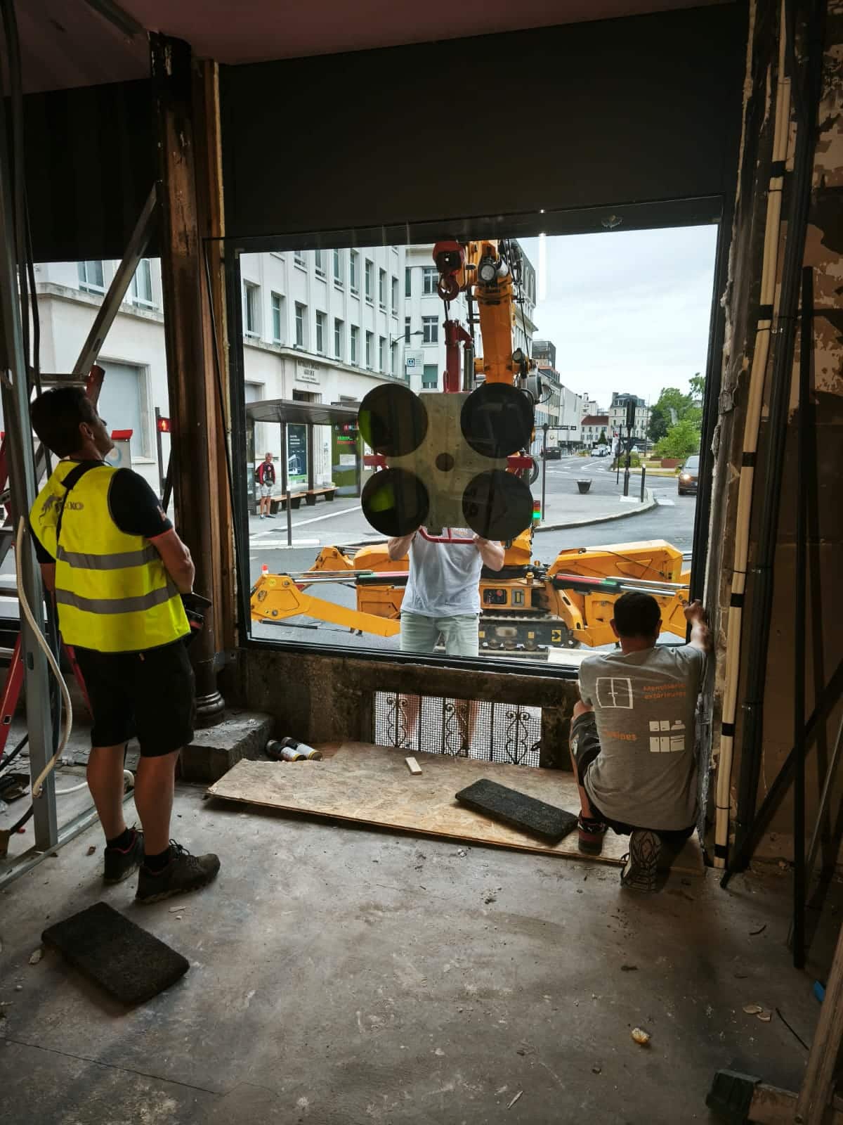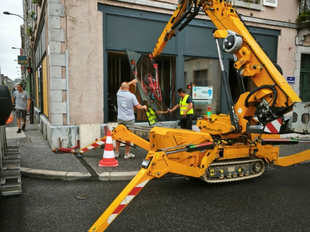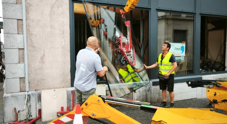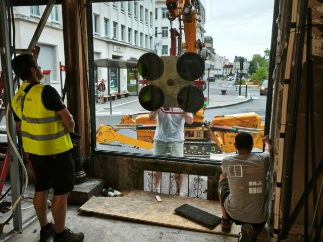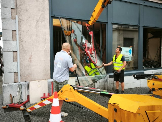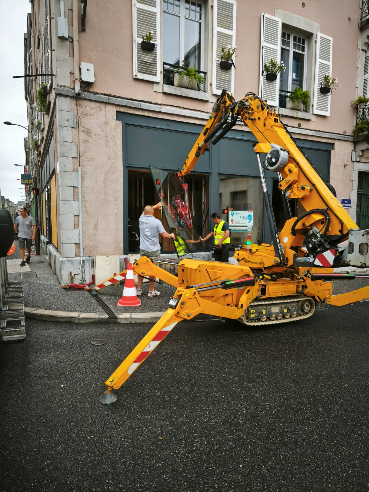 La particularité de ce chantier à Pau résidait dans la manipulation de vitrages lourds en centre-ville.