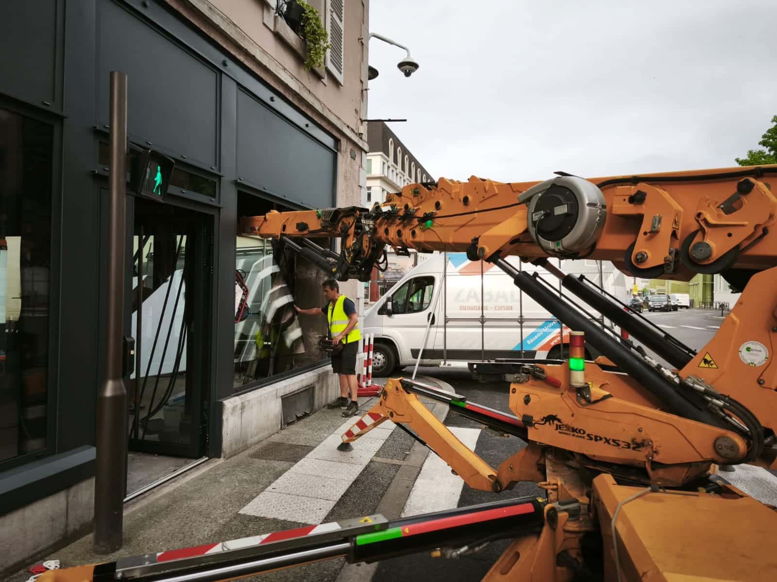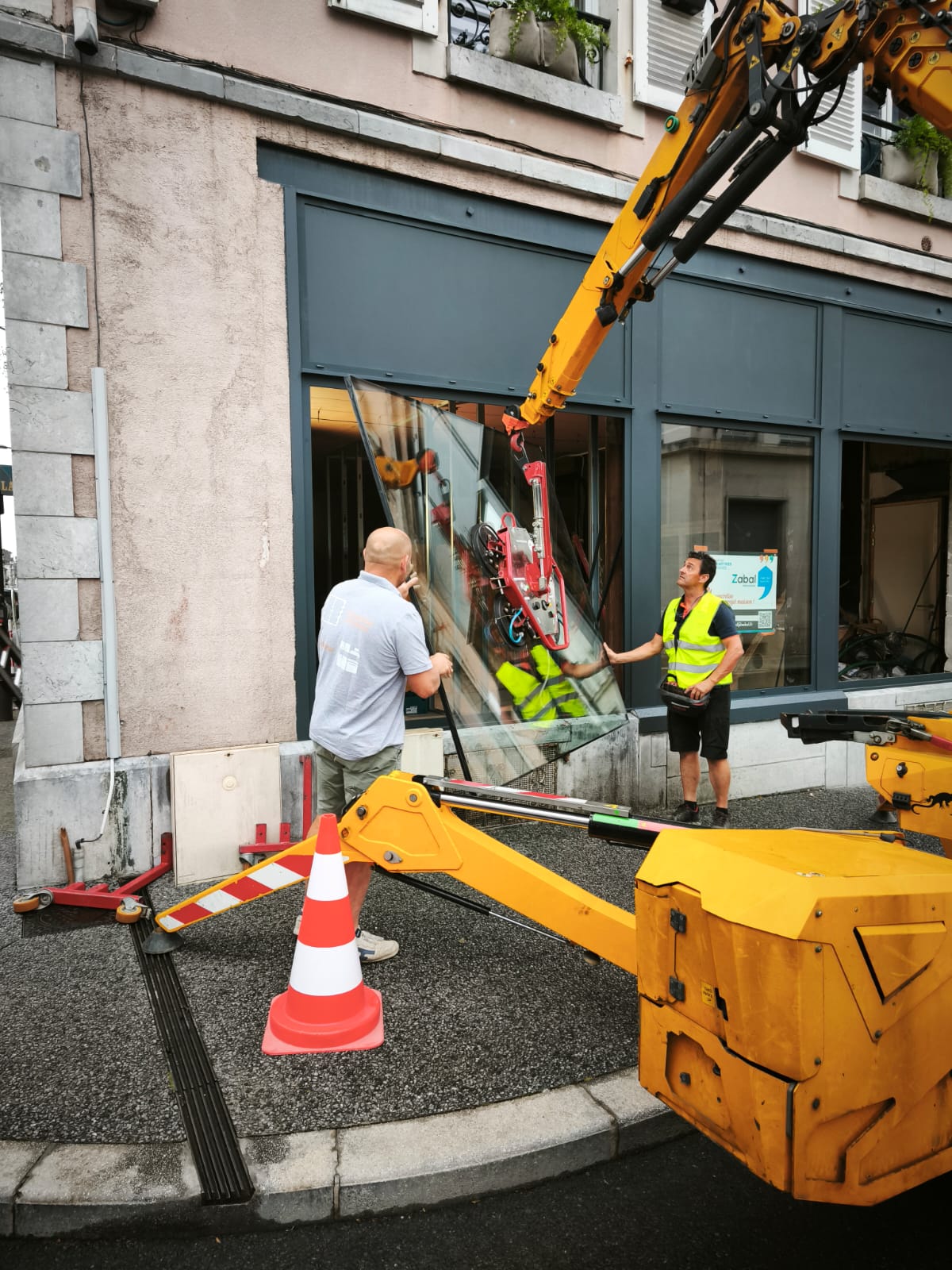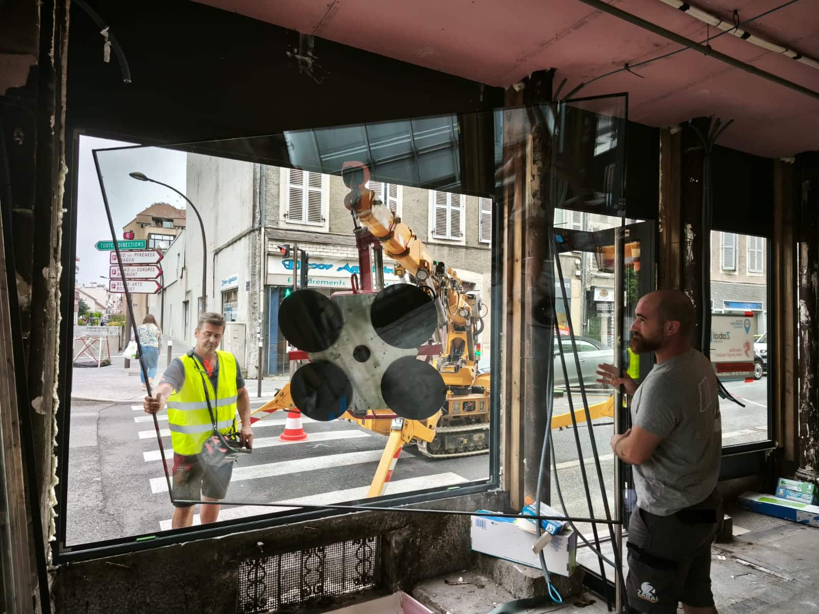 La particularité de ce chantier à Pau résidait dans la manipulation de vitrages lourds en centre-ville.